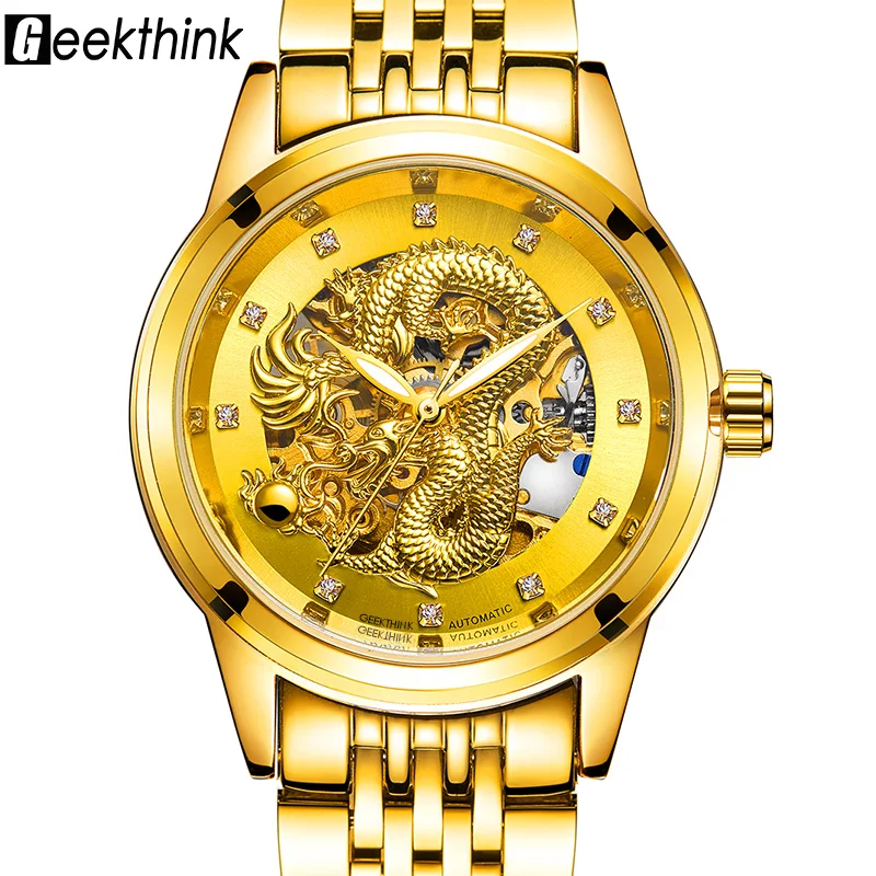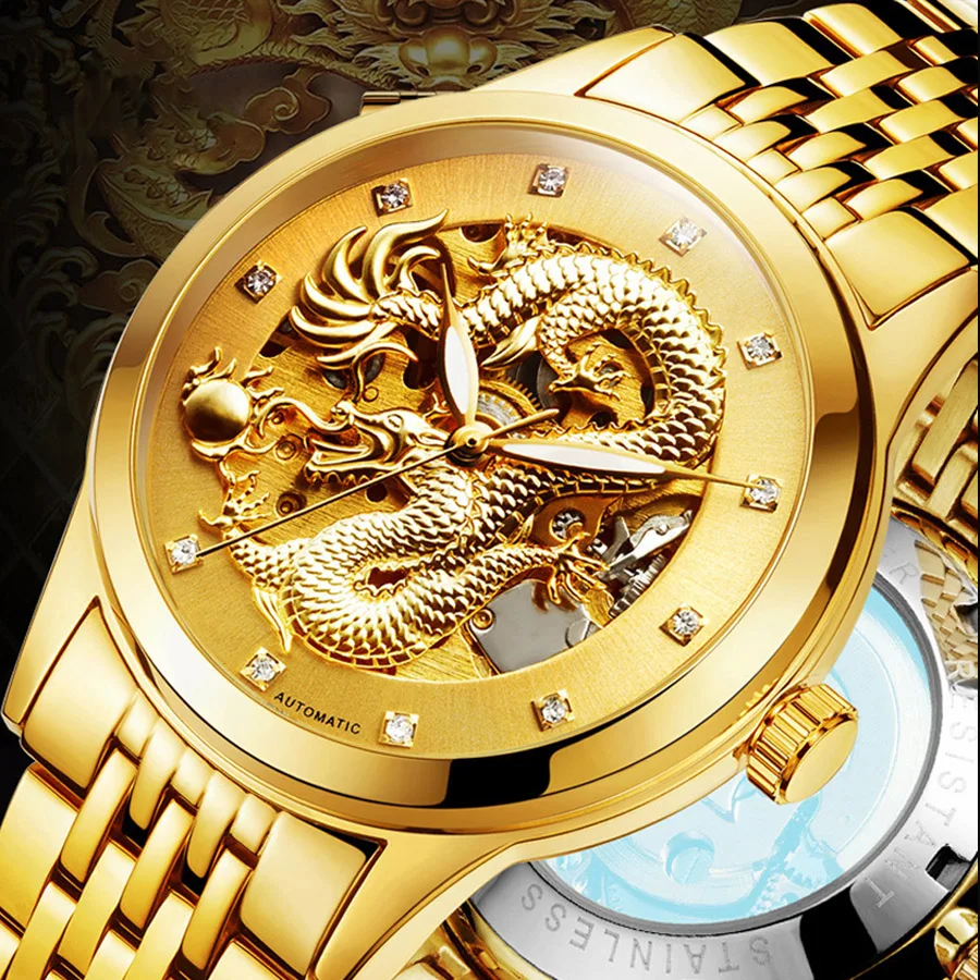 Achat Luxe Top Marque Dragon Design Montre Automatique Hommes Squelette En or en acier Inoxydable Montre Mécanique Squelette Steampunk Pas Cher Prix