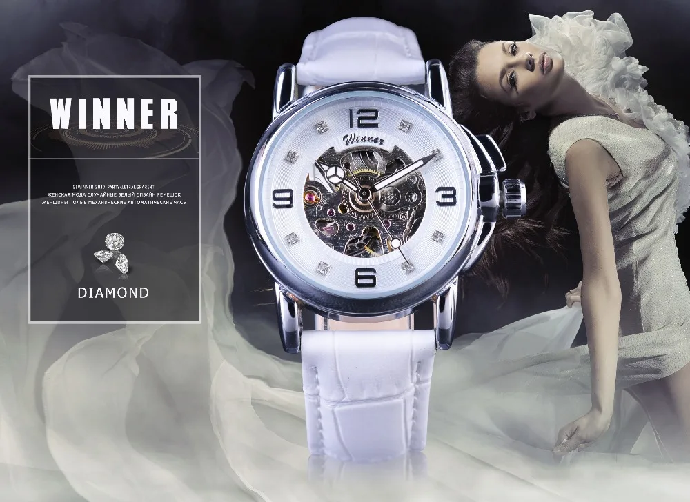 Achat Meilleur Gagnant 2017 Dames Diamant Affichage Femmes Top Marque De Luxe Blanc Simple Squelette Transparent Cas Automatique Mécanique Montres Pas Cher En Ligne.