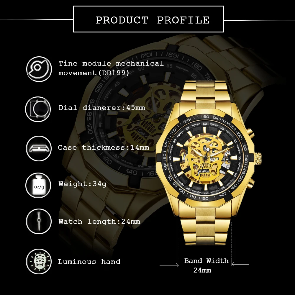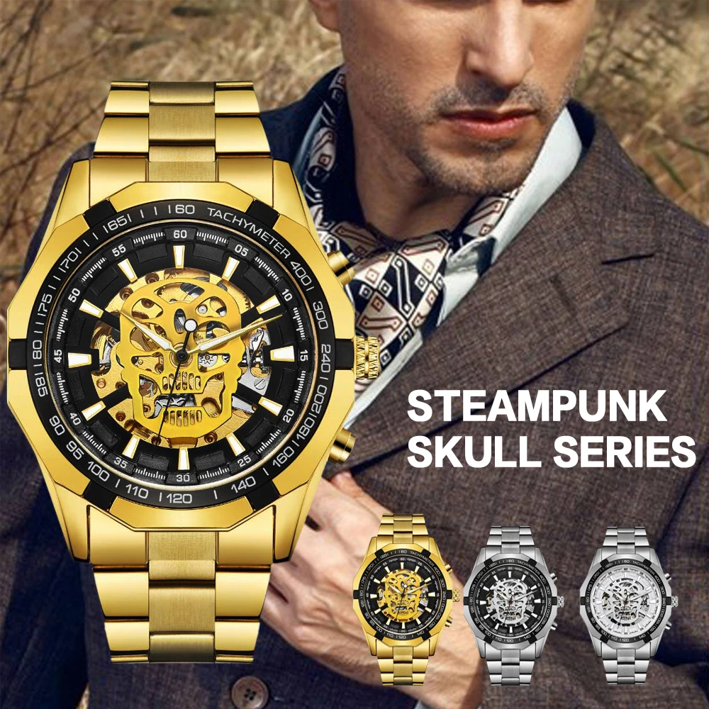 Acheter Mode Montres Mécaniques Pour Hommes Crâne Conception De Marque De Luxe En Acier Inoxydable Doré Squelette Automatique Montre Bracelet Relogio Masculino Pas Cher Prix