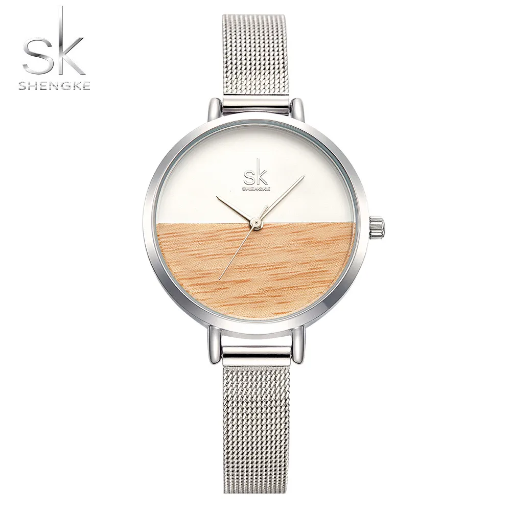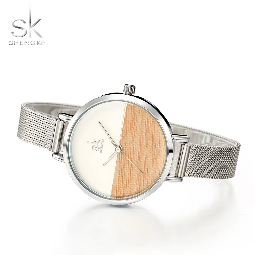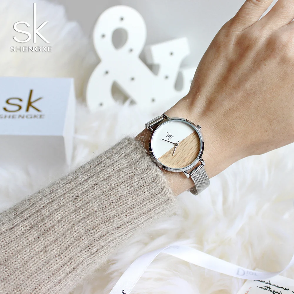 . Vente Shengke Nouvelles Femmes Montres De Luxe Marque Montre Or Rose Femmes Quartz Horloge Creative Bois Motif Cadran Bracelet De Mode SK Pas Cher En Ligne.